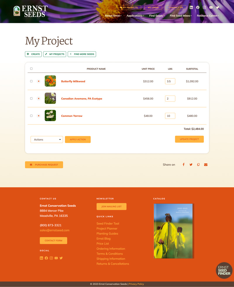 The experience on the site mimics a regular eCommerce site, with single product pages and in-depth faceted filtering and sorting incorporated on a Seed Finder Tool. Instead of adding products to a cart, customers add them to projects they can create and edit. Those projects are then sent to Ernst directly from the site, giving the sales team all the information they need about the customer and their order.