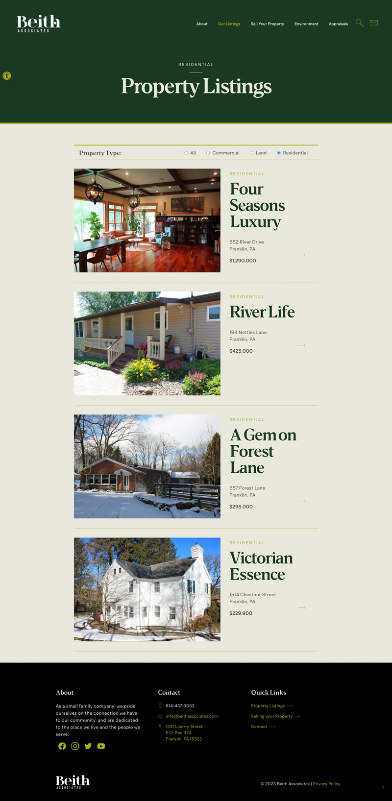 The solution was creating a clean UI that departs from the noise and busyness of conventional real estate websites. Each property listed on the site gets the atention and time it deserves, reflecting the care Beith Associates dedicates to each and every one of their clients.