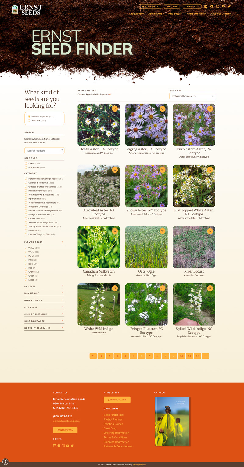 The experience on the site mimics a regular eCommerce site, with single product pages and in-depth faceted filtering and sorting incorporated on a Seed Finder Tool. Instead of adding products to a cart, customers add them to projects they can create and edit. Those projects are then sent to Ernst directly from the site, giving the sales team all the information they need about the customer and their order.