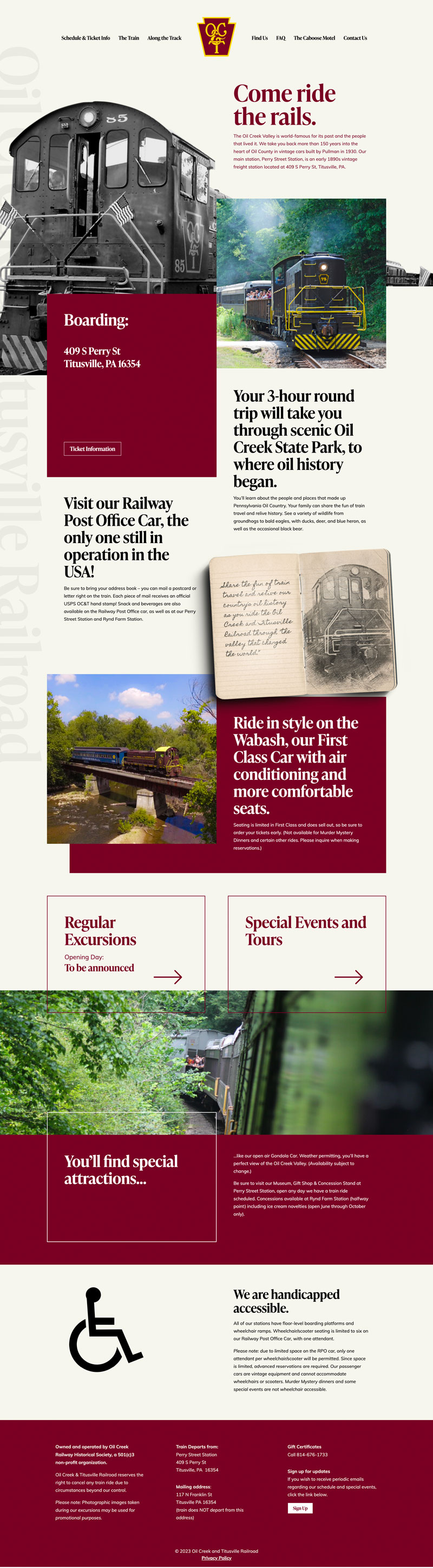 Oil Creek and Titusville Railroad had a website that looked older than its locomotives. And they're from the 50s. A new look and feel was develop to reflect the adventure factor of riding a vintage train through some of the most iconic landscapes in PA.